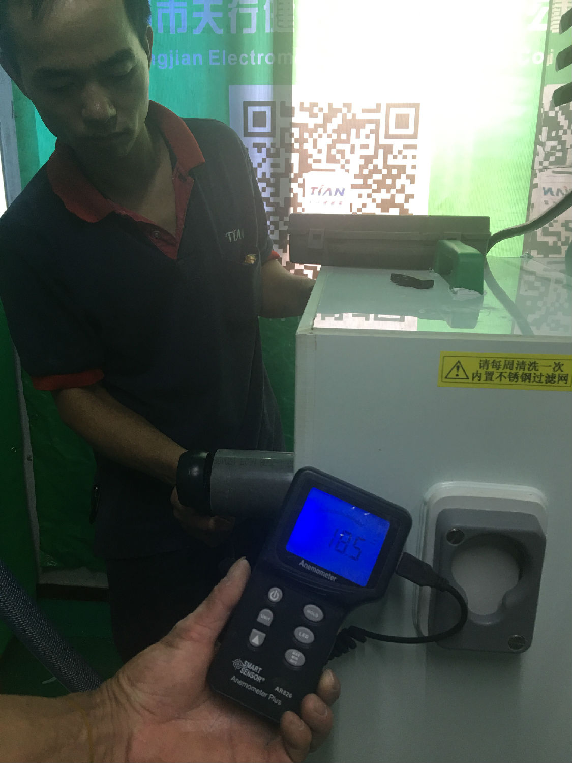 工程師用風(fēng)速表對(duì)破泡機(jī)風(fēng)速檢測
