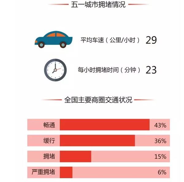 但也不是所有人可以拼出長假,趁著有限的假期吃喝玩樂成了不少人的選擇。據高德地圖預測,五一期間,全國近六成主要商圈交通都不暢通,全國城市平均車速為29公里/小時,每小時車程有23分鐘都在擁堵中度過。東莞、深圳、北京的高速將面臨擁堵,青島、天津的火車站附近交通狀況也很不樂觀。